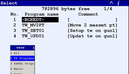 程序文件被自动存储于控制器的 CMOS(SRAM)中,通过 TP 上的 【SELECT】 键 → 按 F1选择 TP Program 就可以显示程序文件目录 。